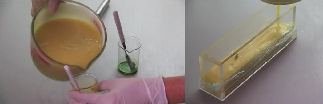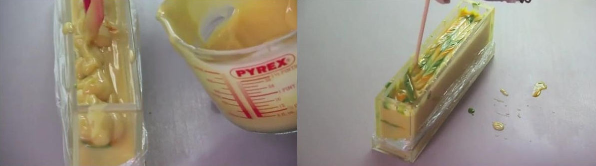 una vez mezclada la sosa con los aceites separamos dos pequeñas porciones de la mezcla y le añadimos dos colorantes distintos. A continuación vertemos la mitad de la preparación original en el molde.