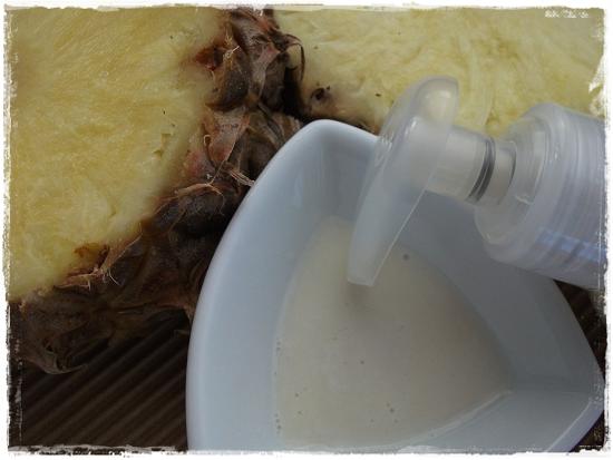 Aceites vegetales: caprylis, almendras, caléndula, cártamo. Hidrolatos: grosella, fresa, piña y pomelo. Aceite esencial de pomelo, fragancia de piña. Cera nº2.
