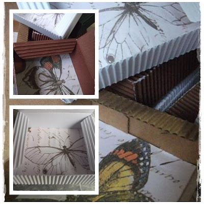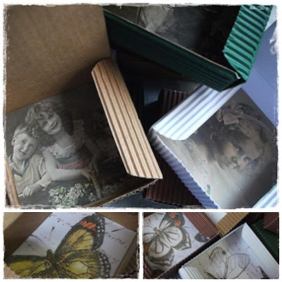 Dentro están parcialmente forradas con papeles de diferentes motivos vintage, lo que les dan un aire más retro. Otras opciones son recortar una ventanita en el frontal para ver el contenido de la caja, o salpicarlas una vez terminadas con gotas de pintura de distintos colores.