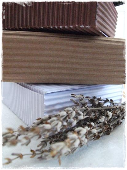 Me apetecía mucho fabricar mis propias cajitas artesanales, así que me puse a diseñar una plantilla sencilla en cartón ondulado de 6 x 7 cm en la base, nada como para tirar cohetes.El resultado son unas cajitas más bien sobrias pero elegantes, sencillas, sin ornamentos innecesarios. Tonos tierra, verde y blanco.