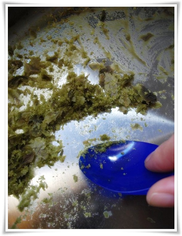 Paso 6. La recogemos y la colocamos en un paño limpio de algodón. Lo ideal es trabajar con bastante cantidad de pulpa de una vez, para que el exprimido sea más cómodo. He de advertir para aquellos a los que no les sea familiar, que de entrada el olor del aceite de aguacate puro es bastante intenso y muy peculiar.